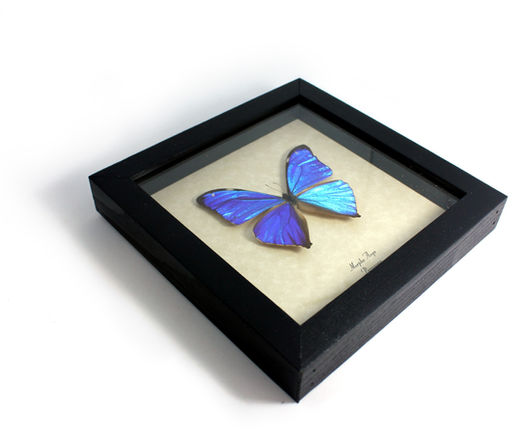 We are able to offer almost any butterfly or insect in custom frames! We can offer three options for framing, price and lead-time will depend on the rarity and size of the specimens selected (typically 4-6 weeks). All framed pieces coming with mounting hardware affixed to the back for immediate hanging capability